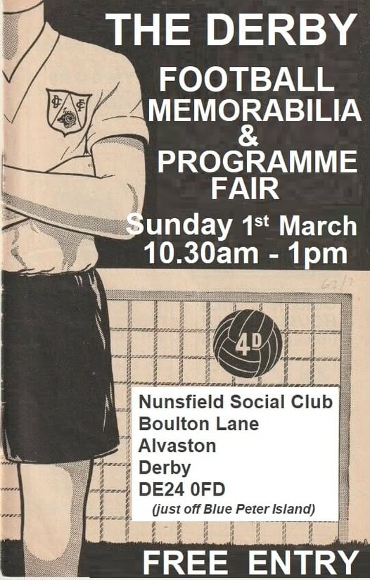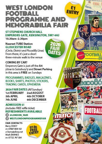 This coming Sunday 1st February 2026 it’s the first West London Football Programme and Badge Fair of 2026. Everyone welcome and there will programmes, badges, shirts, tickets, cards, books, magazines and much more. I know Les Easterbrook will be there with a big range of badges and that Mark Barnes has an ever growing selection of shirts and memorabilia.