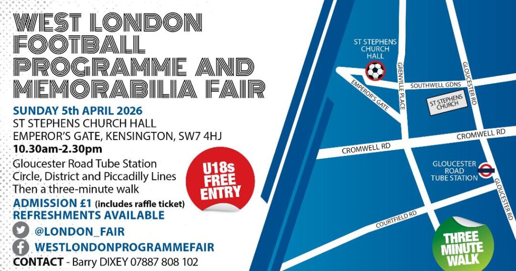 Yes, time and tide have caught up again and I am delighted to confirm that all the signs are that the West London Programme Fair on Easter Sunday will be a BIG one. Yesterday many were at QPR for their History Day events and that was excellent so Barry and Mark will have to work hard to improve on it. I am feeling confident!