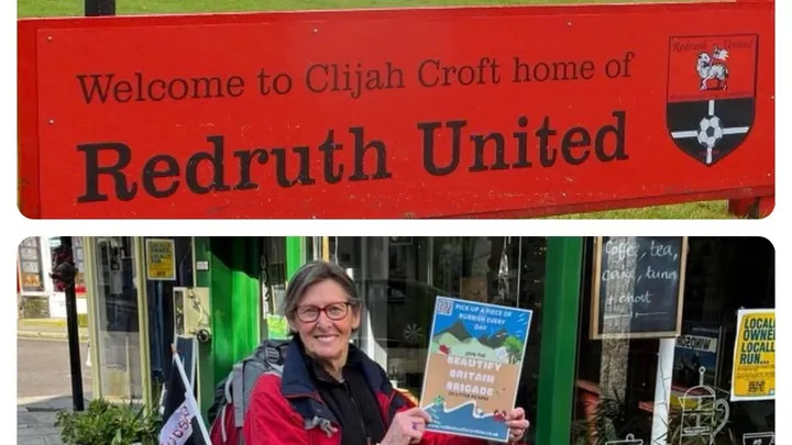 “Hi! My name is Rubbish Ruth& I’m 79 years old. Starting on the 29th April I plan to travel across England from Folkestone to Carlisle using my free bus pass & am appealing to the great British public to support my travels & donate generously to Redruth United Football Club. Currently there are 16 teams, including ladies, girls, youths, adults and veterans, all supported by amateur & volunteer coaches and trainers. They desperately need a new club house to accommodate their recent increase in the number of teams they support. Please donate to this very worthy cause…..Every little helps! Thank you!