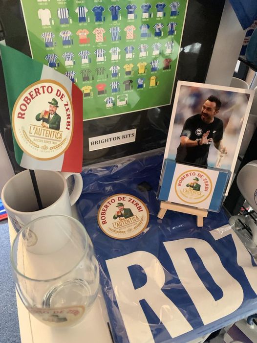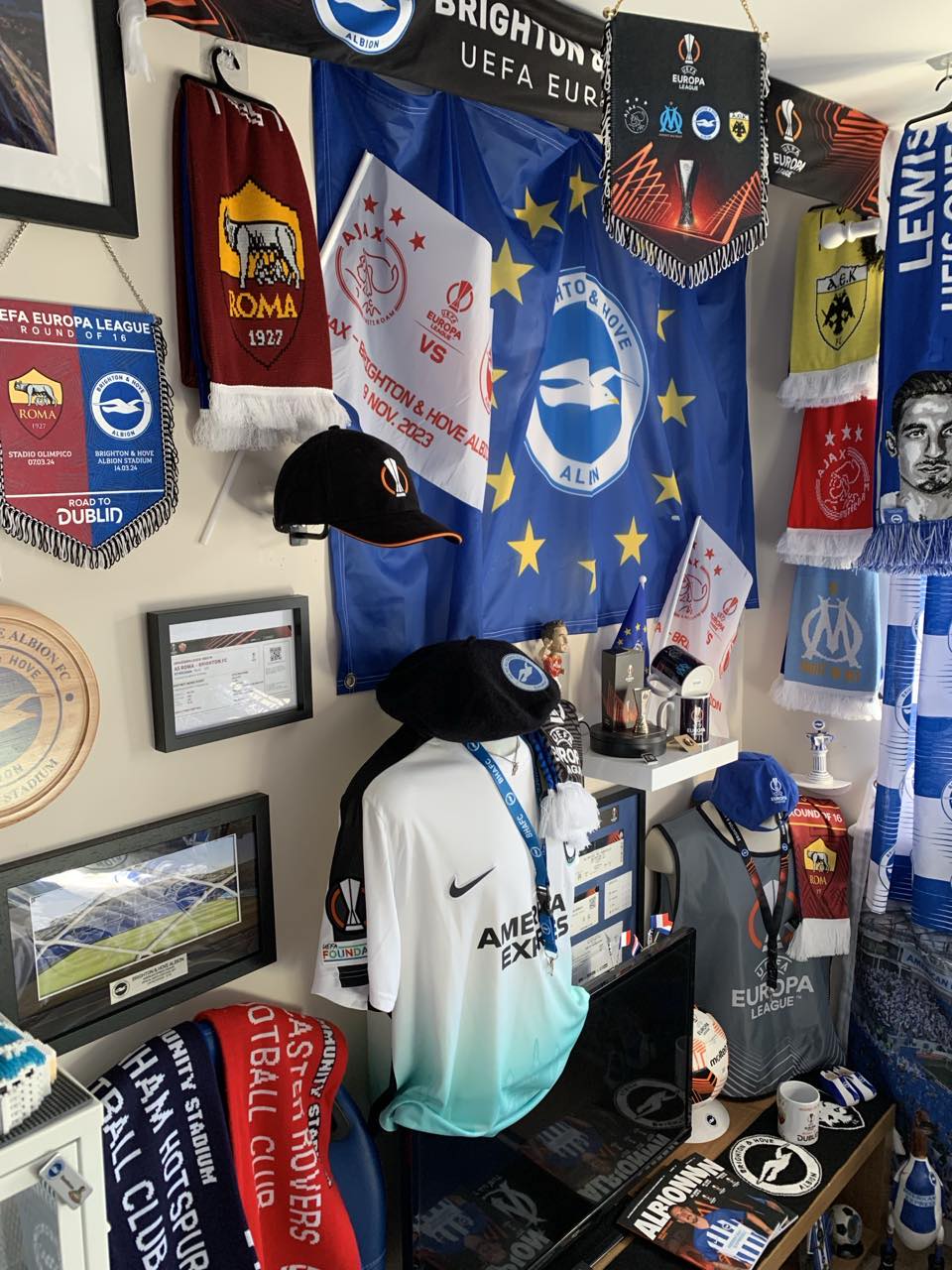 … but back to Alan. He has the most sensational collection of Brighton shirts, programmes and memorabilia dating back to 1978. Obviously he has been through the traumas of The Goldstone Ground, Priestfield Stadium, Withdean and now enjoys his football at one of Europe’s premier stadiums. He has been through the “Fans United” events and everything that ensued. You can talk to Wimbledon, Scunthorpe, Bury and Brighton fans …and, sadly to fans of many other clubs who have been failed (to be polite!) by their own directors. There is a common theme. Tragically few have come through the darkness of homelessness, administrations, bankruptcies etc and out onto the “sunny side” and certainly none so like Brighton. As Alan says, “As an Albion Fan for 45 Years, the best 18 Months of my Life! As an Albion Memorabilia Collector, I never ever thought I would have to find an area in The Brighton Room for European bits. All been a bit of a Dream. For that Roberto, I have made you a Corner in the Room (see above.) Hope you like it and thank you. Cheers.”