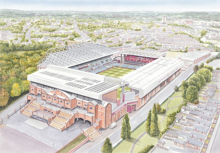As he says, “Now finished my latest football stadium watercolour – ‘Villa Park’ as seen facing the Holte End entrance. 25 hours of drawing and painting to get to this. Prints available from my website