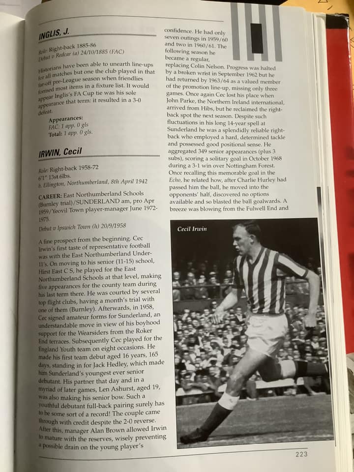Ben said, “Hi folks, bit of a long shot here but does anyone have any magazines, articles, memorabilia etc pertaining to Cecil Irwin who played for Sunderland in the 50’s & 60’s. Cecil is my wife’s grandad and is suffering a bit with dementia and other ailments, however loves to see and talk about things from his playing days. He has no problem remembering those days, so trying to get as much as I can for him.”