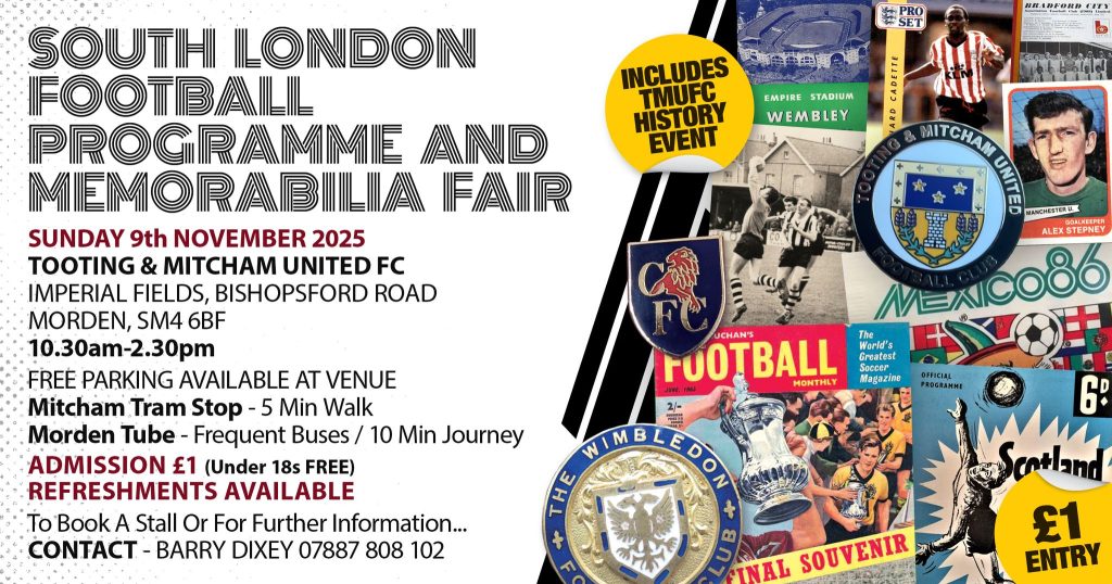 Only one week to go as our next Football Programme & Memorabilia Fair is next Sunday, 9th NOVEMBER at Tooting & Mitcham Utd. FC, Imperial Fields, Bishopsford Road, Morden. SM4 6BF. Starting at 10.30am.