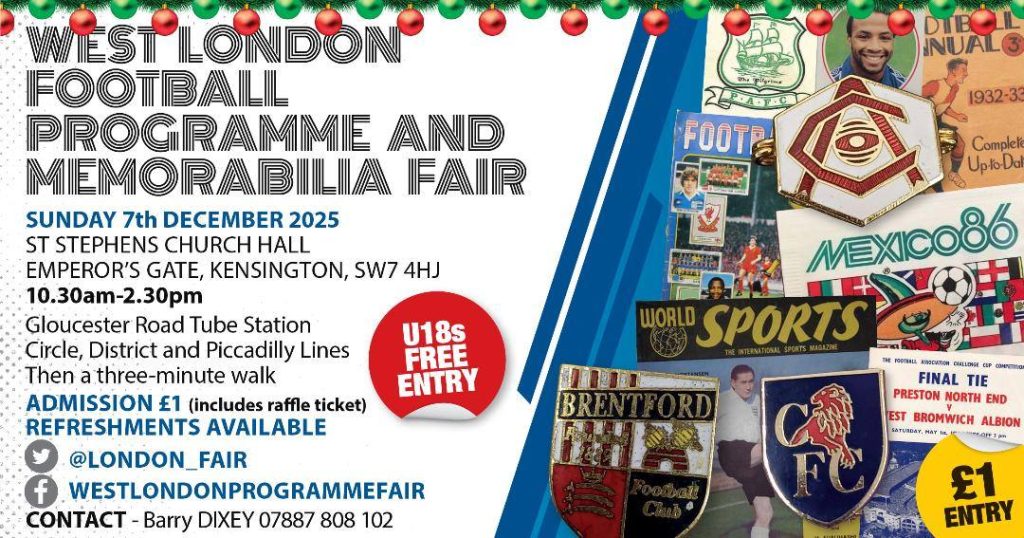 I should add that Lee Hermitage from North Middlesex Football Programmes and Memorabilia will not be in attendance. He has been a pillar at these exhibitions for many years but he confirms you can always make contact with him through his recently-updated website