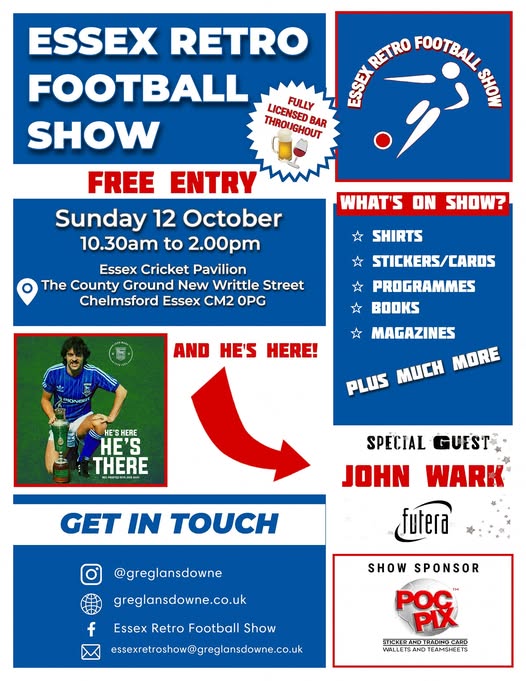 The Essex Retro Football Show takes place at the Ambassador Cruise Line Ground on Sunday 12th October from 10.30am to 2.00pm. Entry is free and a fully-licensed bar will be in operation.