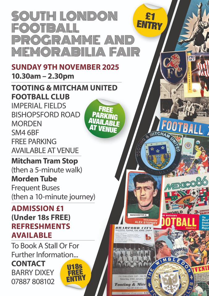 GREAT NEWS. We have an extra special programme and memorabilia fair at the excellent Tooting & Mitcham United Clubhouse