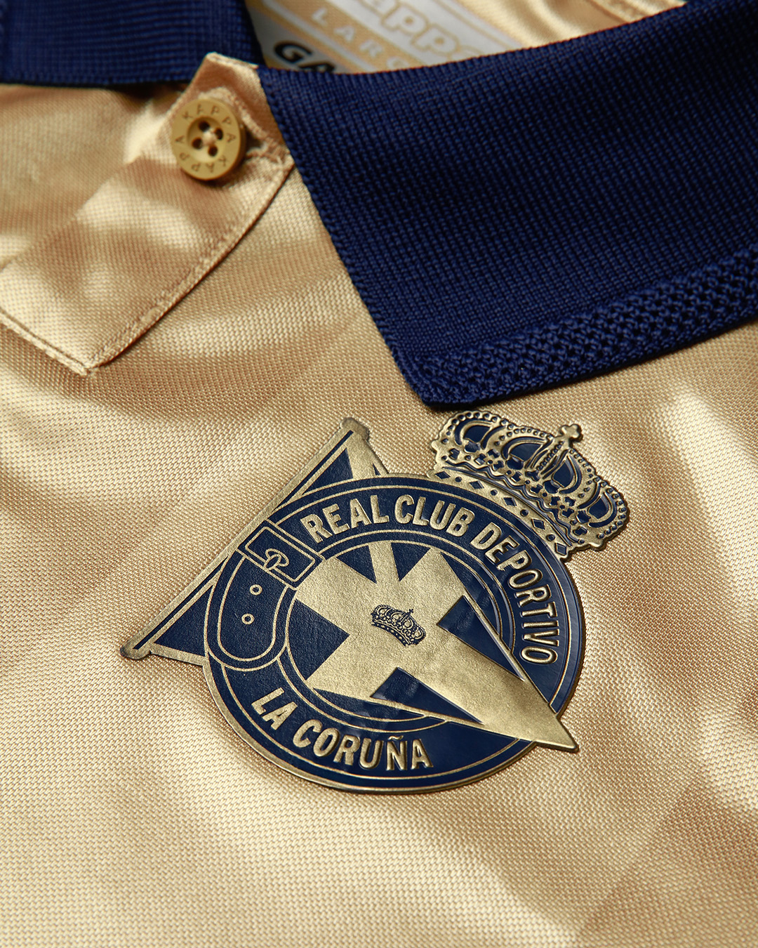 The short-sleeved version features gold fabric with subtle vertical striping, a navy polo-style collar, navy trim on the cuffs, and navy sponsor logos. The long-sleeved version has a cleaner look with no sponsor and features navy cuffs. Both editions carry a special inside neck print marking the 25th anniversary of the title and highlighting Deportivo’s league triumph on 19 May 2000, when they defeated Espanyol 2–0 at the Riazor. Only nine clubs in Spain have ever lifted the title.
