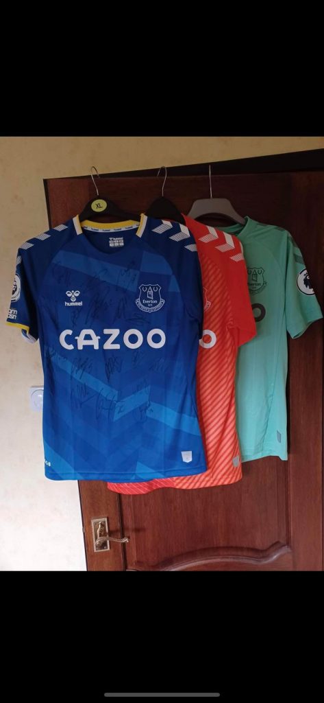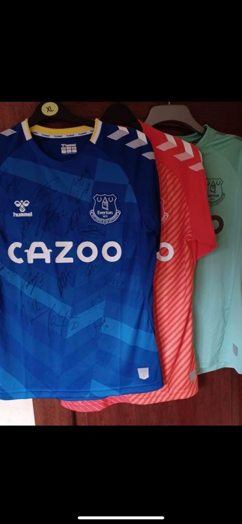 We have now received the 3 signed Everton shirts that was very kindly donated by Peter Kenton‘s son who works at Everton football club. The auction for these shirts have already started and here’s what we’ve got for them so far: