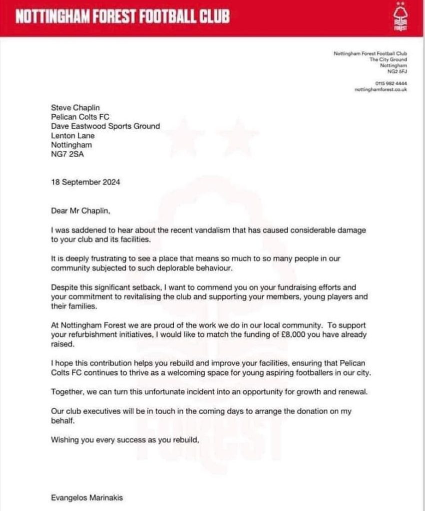 The Forest owner Evangelos Marinakis wrote in a September 18 letter to the club’s chairman, Steve Chaplin: “I was saddened to hear about the recent vandalism that has caused considerable damage to your club and its facilities. It is deeply frustrating to see a place that means so much to so many people in our community subjected to such deplorable behaviour…