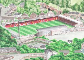 Many of you know (or are learning with this tour!) that I am a great lover of art. Tragically I cannot draw a straight line. That does not stop me admiring people like Football Cartoons, Gillingham Legends and Dave Baldwin at Papilios Creative. Dave is a huge Villa fan but now lives in Cheltenham. I asked him whether we could do a piece on Cheltenham and he was pleased to agree. Despite what Shankly might say “Some people believe football is a matter of life and death, I am very disappointed with that attitude. I can assure you it is much, much more important than that.” I know the great man was maybe tongue in cheek. Dave and I got talking about his art and I was delighted to find he has an exhibition near Cheltenham this week. Jonny-Rocks/Completely Suzuki/Wheldon Rd can wait! He sent me this update….